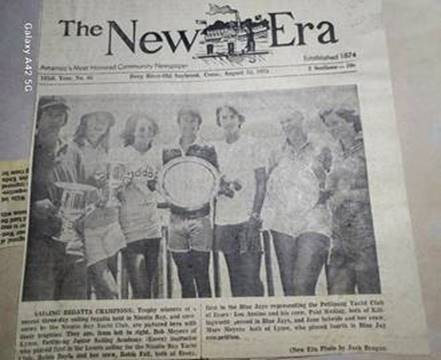 [cid:image002.jpg@01DB9AF8.59E83A40] JULIE DUNBAR REMEMBERS 1974 Bob Cashman reminded me that the Pettipaug BJ Nationals were held in 1974 which saved me some time in looking it up. Bob sailed Blue Jays actively along with many other Junior sailors and still has fond memories to share! In 1974, my husband, Bill and I had recently purchased a Blue Jay for our family. They were actively sailed at our small club, Shrewsbury Sailing and Yacht Club, Oceanport, NJ . When notification of the National Regatta came about, we decided to join a few other members and make the trip up to Essex, CT. to participate, some coming by boat and others by car. At that time, Bill's Aunt June and Uncle Carlton Barlow were living on Book Hill Road so we contacted them in hopes of using their guest house as "home base" for this regatta, which worked out perfectly, so all was set to enjoy a good weekend of Blue Jay sailing. The Club was decked out in the finest of flags, cars were parked here, there and everywhere, Blue Jays and more Blue Jays were being moved about, and the shouts of kids and parents lingered in the air! On the water, boats and more boats! Spectators and sailors both!! It was an exciting time! The races went off without a "hitch" as the Pettipaug group knew just how to organize and run regattas, plus the weather was cooperating. The NJ sailors and others who had come up from Barnegat Bay, NJ had their great learning experience with the CT River current. In fact, the crew in our Blue Jay fell overboard during the race and our daughter, Debbi, leaned over and pulled her back into the boat hanging onto her shirt as the current pushed her by. And, back then, one had to watch out for the barges that were making their way to Hartford. It was at this regatta that Bill was asked and decided to join the Blue Jay Class Association Board along with Dan Van Winkle of Mason's Island, Bill becoming President awhile later. As I was so new to sailing and racing, I did not begin to understand all the preparation, excitement and frustration at that time but truly appreciated the friendliness and dedication everyone was making! It will always remain as a very special event in my mind! [cid:image003.jpg@01DB9AF8.59E83A40] THE 1974 PYC REGATTA WINNERS~ CORRECTED the ABOVE ARTICLE and this photograph appeared in the NEW ERA NEWSPAPER and were donated to by Robin Doyle. Julie Dunbar wrote the wonderful remembrance. Bill became President of Blue Jay International and Julie was Secretary. When they moved to Connecticut, they joined PYC, supported the Women's Sailing Group and are Co-Founders of the Wednesday Night Blue Jay Series! NEXT~ Mary Risseeuw remembers
