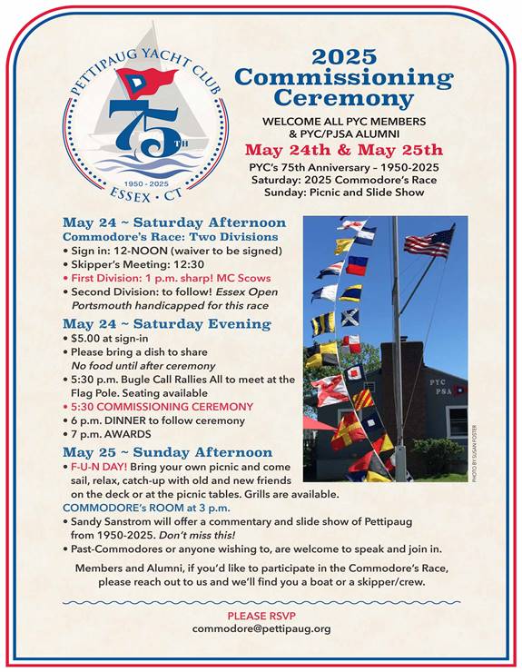 STICKERS A little help. To download the form to your computer, click this link: https://www.pettipaug.com/PDFdownload/2025BoatStorageAgreement.pdf The PDF form will download immediately and be in your downloads folder. Questions: secretary@pettipaug.org<mailto:secretary@pettipaug.org> NEXT WEEKEND HOPEFULLY we will have good weather for these festivities. PLEASE watch for weather up-dates by NOON on Friday. If we need to move Saturday's activities to Sunday, May 25th, you will be alerted. MAY 24 The COMMODORE's RACE this is he NOR link https://pettipaug.org/PYC-Calendar2.html?tkf.path=/pettipaug/detail/156/1748... SIGN IN: NOON SKIPPER'S MEETING: 12:30 2 DIVISIONS: MC SCOWS start: 1 pm (1300) ESSEX OPEN start: 1 :15 pm (1315) AWARDS: 1,2,3 in each division. At this time there is not a perpetual trophy for this race. The COMMISSIONING & 75th ANNIVERSAY CEREMONY CHECK-IN: $5.00 - please bring a dish to share and serving utensils if needed. Good idea to put your name on anything you bring. 5 p.m. Bar open on the deck. THE COMMODORE'S ROOM WILL NOT BE OPEN FOR DINNER UNTIL AFTER CEREMONY Thanking all in advance for respecting this. 5:30 p.m. Bugle signals all to go to the FLAG POLE area. There will be a limited amount chairs. CEREMONY begins when members are settled. Closes with the Announcement that the 75th Season is open. CANON fired. Bugle signals: DINNER is on! POST DINNER AWARDS : Bob Cashman , PRO for Commodore's Race MAY 25 Noon: Bring a picnic, BYOB, sail, relax, enjoy old and new friends . 3 p.m. in the Commodore's Room, Sandy Sanstrom will share PYC slide show. All are welcome to share PYC stories and memorable moments. [cid:image001.jpg@01DBC574.4BDFD4C0]